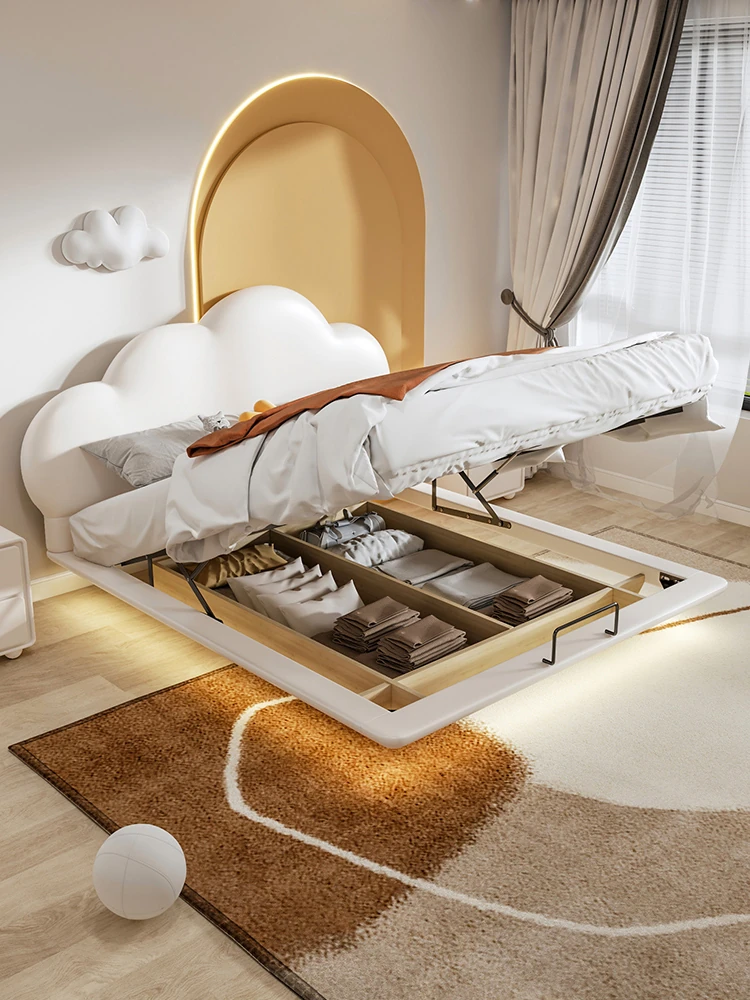 ナチュラルウッドの収納付きモダン寝室用レザー製ベッド!軽やかで贅沢なプリンセスデザイン、浮遊感のある小さな雲のようなベッド。お子様の特別な空間を演出します!