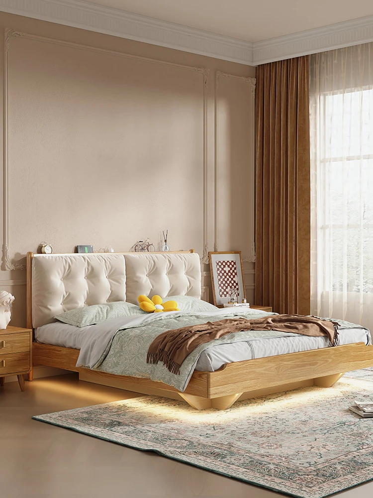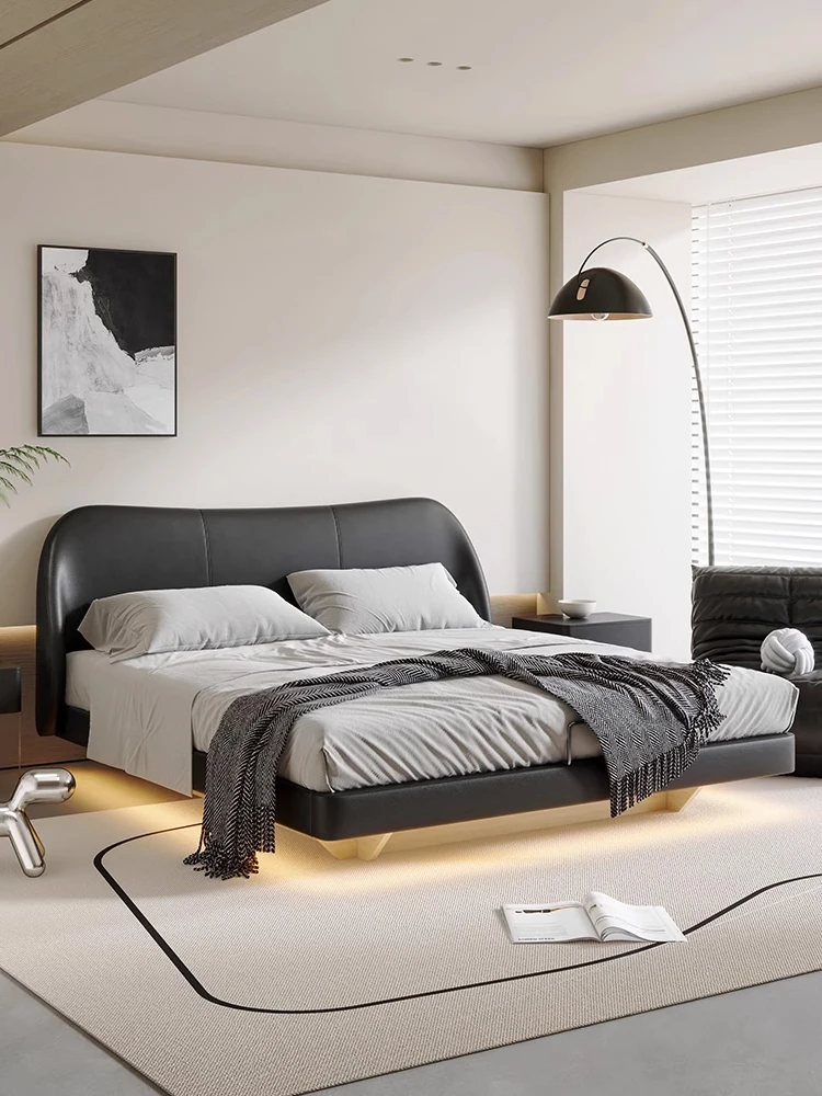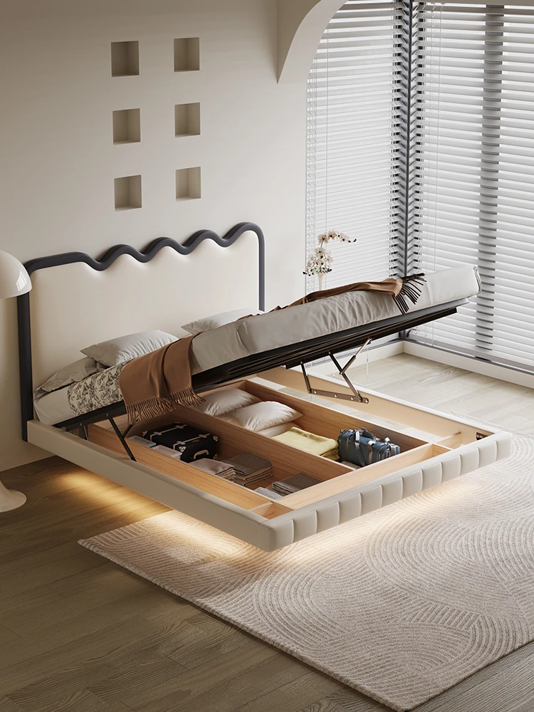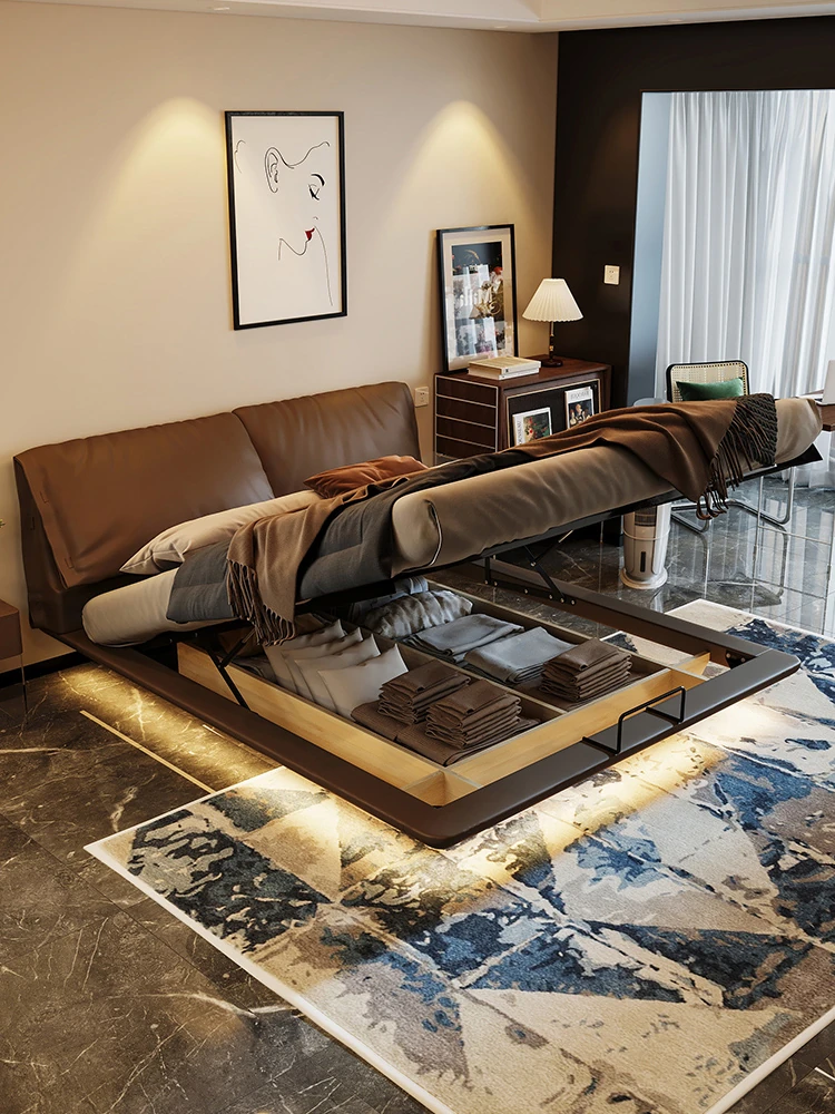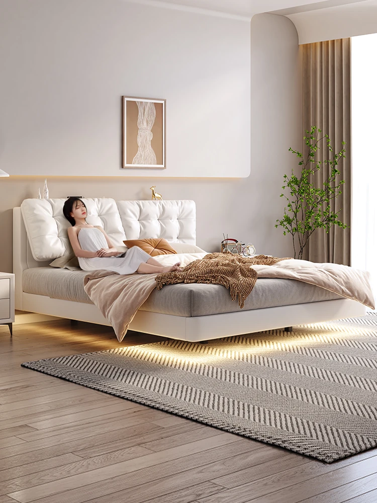 2025年新作!モダンで軽やかなフレンチスタイルの本革ベッド - 心地よい雲のようなデザインと収納機能付きのダブルベッドで、主寝室をラグジュアリーに演出。