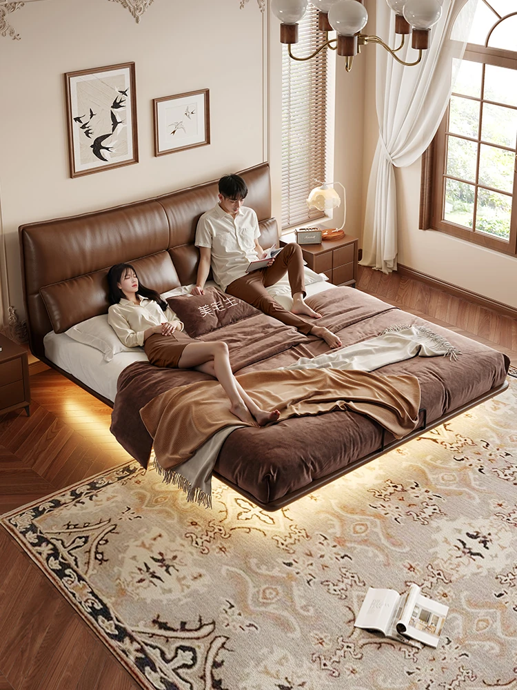"象の耳デザイン本革フローティングベッド1.5/1.8m収納付き空中ソフトベッド - モダンで多機能なスタイル!"